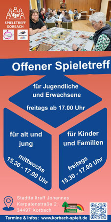 Seit 2019 bringt der Spieletreff Korbach Menschen zusammen, die die Freude am Spielen teilen. Was mit einem offenen Treff für Jugendliche und Erwachsene begann, ist heute ein regelmäßiges Angebot an drei Terminen pro Woche: Spielen für Jung und Alt, für Kinder und Familien, für Jugendliche und Erwachsene.